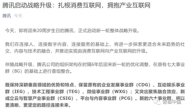 今天,港股“股王”腾讯正式宣布,启动新一轮整体战略升级。在原有七大事业群(BG)的基础上进行重组整合,调整为六大事业群。